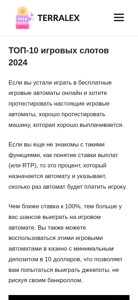| AI-анализ | This online resource is a gaming website dedicated to providing information about the top 10 slot games in 2024. The title of the website is "ТОП-10 игровых слотов 2024 - terralex.by". The website features a menu with topics such as "ТОП-10 быстрых игр в казино 2024" and "Особенности ставок на быстрые игры в казино онлайн". It also offers explanations on how to win jackpots in slot machines and introduces the concept of the return to player percentage (RTP). The website suggests that players can try out these slot games in casinos with a minimum deposit of 10 dollars. Additionally, the website offers recommendations for alternative casino games such as Casinozer Mines and Crazy Time. The top 1 |