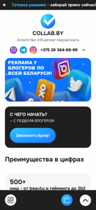 | AI-анализ | This online resource is an agency specializing in influencer marketing, as indicated by its title and keywords. The website's top words suggest that it offers ready-solutions, possibly related to collaborating with bloggers or influencers for marketing purposes. The homepage features a form requiring visitors to fill in their name, organization name, phone number, email, and how they heard about the agency. The form also includes optional fields for radio group, a list with checkboxes, and an option to upload a file. The website includes sections on influencer marketing in Belarus, with topics such as trends, choosing a blogger for advertising in Minsk, and case studies. Other sections cover topics like UGC marketing and measuring ROI. The domain is collab.by. |