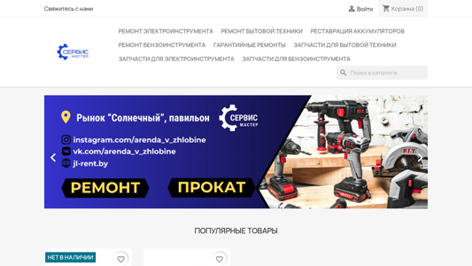 | AI-анализ | This online resource, titled "Сервис мастер Жлобин" (Service master of Zhobin), is a Belarusian e-commerce website specializing in repairs and sales of various appliances, tools, and accessories. The keywords "ремонт" (repair), "техники" (technique), "запчасти" (parts), and "бытовой" (household) are frequently used on the site. The homepage features options for repairing electrical tools, household appliances, and restoring accumulators, as well as parts for these items and garage equipment. The site offers "Гарантийные ремонты" (warranty repairs) and has a search function for easy product discovery. The page also includes links to popular items, a shopping cart, and an "Instagram" icon, suggesting social media integration. The site's |