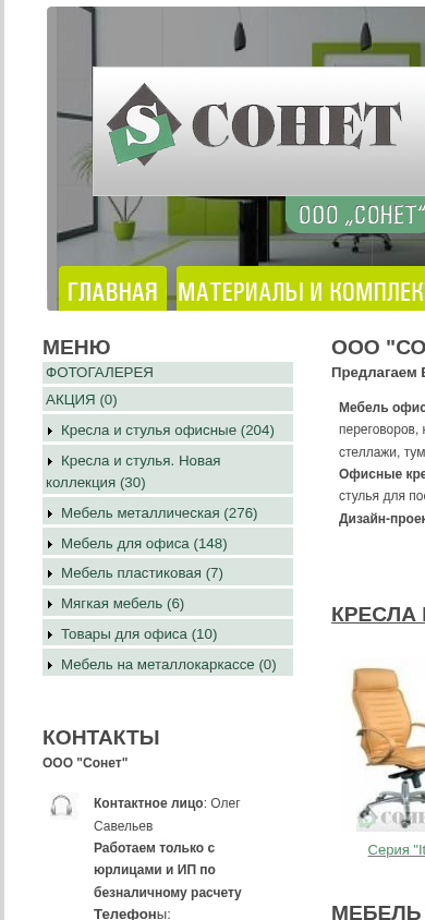 | Название / Заголовок | ООО "Сонет". Брест, Беларусь, офисная мебель, кресла, стулья, сейфы, мягкая и металлическая мебель купить по низким ценам |