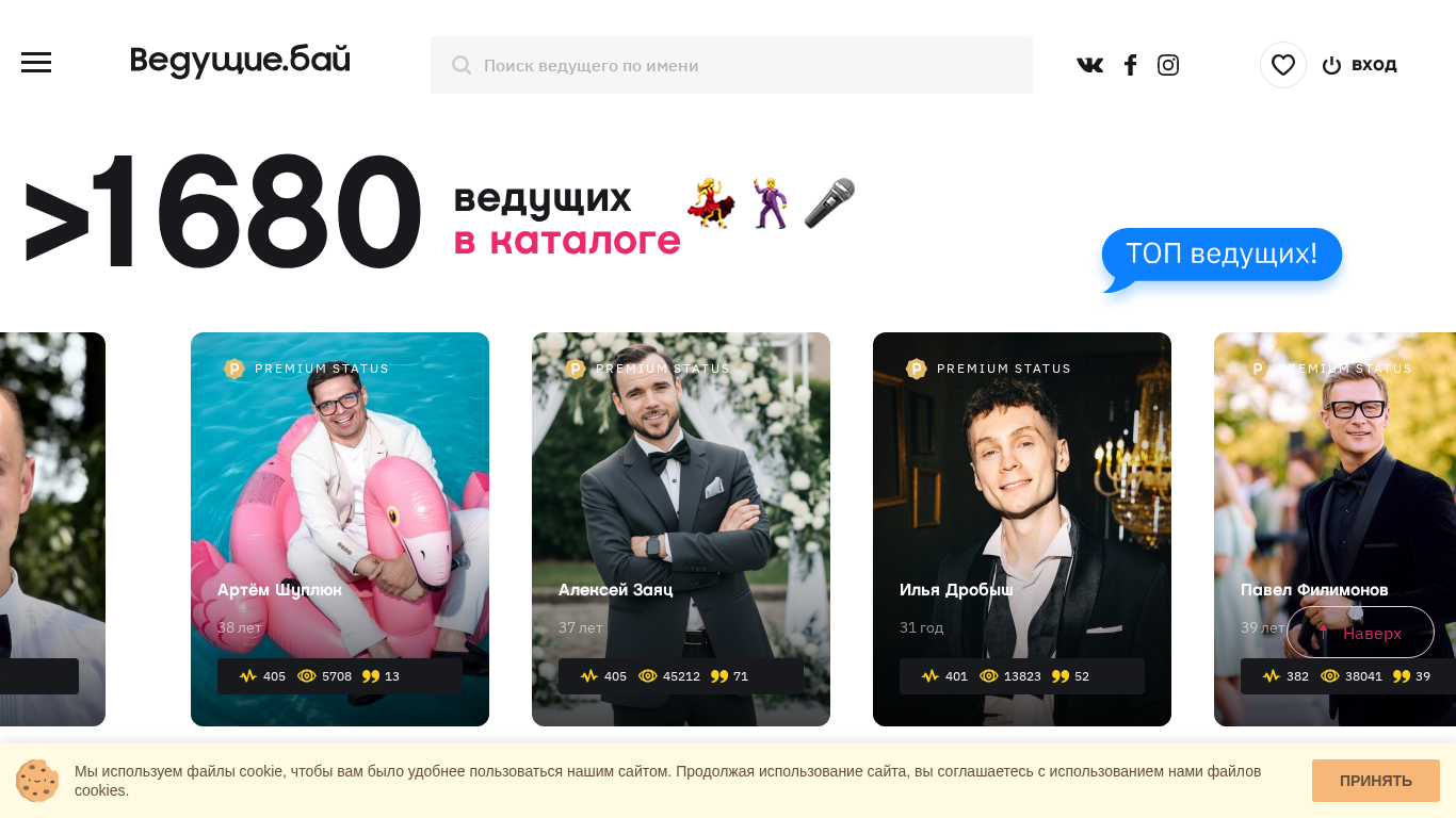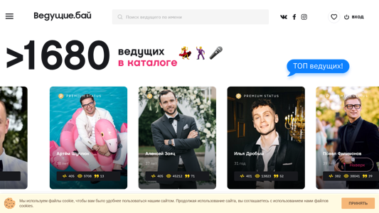 | AI-анализ | The website "Vedushie.by" is a platform for booking professional masters of ceremonies (MCs) in Belarus. The title of the website translates to "Leading MCs for Weddings and Corporate Events in Minsk, Prices, Reviews, Photos - Vedushie.by". The description includes keywords related to weddings, corporate events, prices, reviews, and photos. The top words in the website suggest that the most frequently mentioned topics are "лет" (years), "status" (premium), "ведущих" (MCs), "мужчина" (man), and various city names. The website features MCs in Minsk, as well as in Grodno, Homel, Vitsebsk, Brest, and Mohylev. The website offers services for various types of events such as weddings, corporate events, |