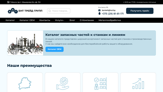 | AI-анализ | The web project "БНТ Трейд Групп" offers comprehensive supply of industrial equipment for various industries. The company specializes in pneumatics, hydraulics, and automation for production. The contact information is bznteh@tut.by, located in Minsk at pr-t. Masherova 54, office 11H, open from 8:00 to 17:00, Monday to Friday. The catalog features a wide range of spare parts for machinery and production lines. The company has been in business since 2017. Popular product categories include pneumo cylinders, solar stations, pneumo distributors, pneumatic fittings, pneumo tubes, hydraulic distributors, hydraulic pumps, and hydraulic cylinders. The company offers repair services for |