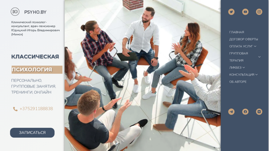 | AI-анализ | --- The portal Psycho.by presents clinical psychology services, including consultations from a retired doctor-psychologist in Minsk, and psychotherapy. Users can make appointments and pay for services using a bank card or through the ERIP system. The website offers group therapy, tango therapy, training, and a forum for consultation. The site also covers topics such as loneliness, sexology, and narcology, including alcoholism and gashesizm. The author of the website is Igor Vladimirovich Yuditsky, a clinical psychologist and psychotherapist with a medical career of 40 years and a therapeutic career of 30 years, having conducted over 40,000 consultations. Users can learn more about the author through a provided link. The site also features a YouTube channel where users can find valuable information. The portal offers professional psychotherapy |