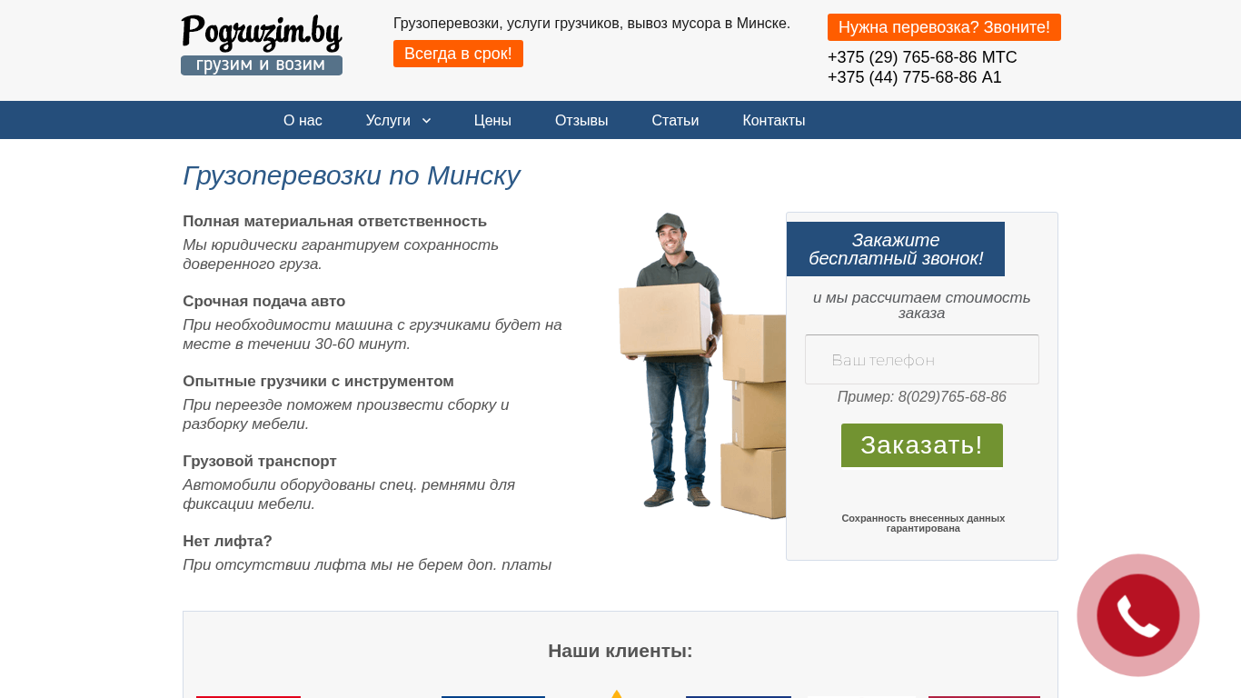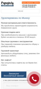 --- This online resource, pogruzim.by, is dedicated to providing affordable cargo transport services in Minsk, Belarus. The website offers hourly rates starting from 35 rubles, and also provides their own vehicles and laborers for hire. The company claims to be the number one service for cargo transport in Belarus. Keywords related to the website include 'cargo transport Minsk', 'cargo transport in Minsk', and 'cargo transport with laborers'. The website includes sections on their services, pricing, customer reviews, and contact information. The homepage displays a call to action for those in need of cargo transport to contact them directly. Services offered include apartment and office moving, furniture transport, piano transport, cargo transport across Belarus, waste removal, and manual labor services. The website also offers a calculator to estimate transport costs based on weight and volume.