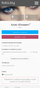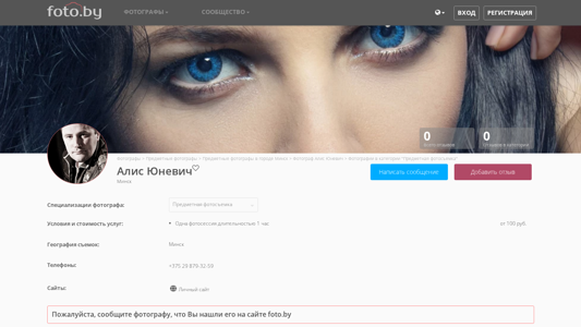 | AI-анализ | The web project "FotografMinsk.foto.by" is a photography website by photographer Alis Yunevich from Minsk. The website showcases photographs under the "Subject Photography" category. Alis Yunevich offers various photography services including subject photography, advertising, portrait, 3D, and 360-degree photo shoots. The photographer works in cities such as Minsk and other locations. The website contains a catalog of photographers, a community of photographers, and a blog. Visitors can write messages, add reviews, and view portfolios. The photographer specializes in subject photography and advertising photography. Pricing and service conditions include a one-hour photo session starting at 100 rubles. The photographer's contact details are provided, including a personal website and phone number. |