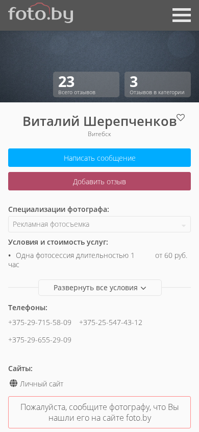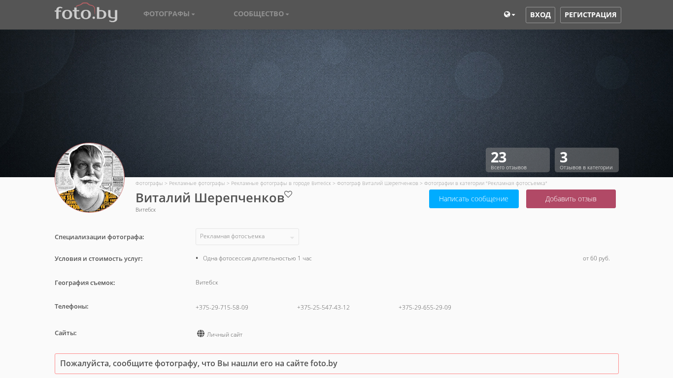| SEO-описание | Фотографии в категории "Рекламная фотосъемка". Фотограф Виталий Шерепченков - выполняю следующие виды фотосъемок: детская фотосъемка, рекламная фотосъемка, семейная фотосъемка. Работаю в городах: Витебск |