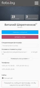 | AI-анализ | --- The web project "VFoto by Vitally Sherepchenkov" is a photography portfolio site focusing on commercial photography. The photographer, Vitally Sherepchenkov, is based in Vitsebsk, Belarus, and offers services in various photography styles such as child, family, and commercial photography. The site features a catalog of his work in the "Promotional Photoshoots" category. Keywords associated with the project include "photography," "photographer," "Vitsebsk," and "promotional." The site receives approximately 3 visits per day and has received 3 reviews in total, all in the promotional photography category. The photographer's contact information and pricing details are provided on the site. |