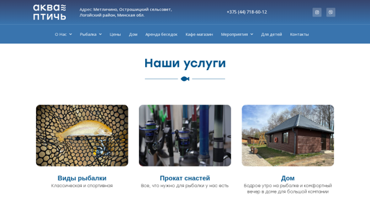 | SEO-описание | Платная рыбалка под Минском в рыболовном комплексе «Акваптичь» с хорошим уловом круглый год. Баня на озере в аренду. |