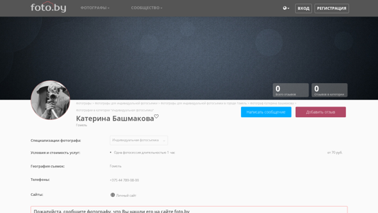 | AI-анализ | --- The website mirbykate.foto.by is dedicated to the work of photographer Catherine Basmaкова from the city of Homel in Belarus. The main focus of the site is on individual photo sessions, as indicated by the keywords and top words present in the title and description. The photographer's services include portrait photography, photo sessions for various occasions such as graduations and weddings, and photo sessions for infants and newborns. The site also offers photography lessons and various other services. The site is part of the foto.by network, as indicated by the subdomain, and includes a community section for users to leave reviews and view other photographers' work. The photographer's contact information, including a phone number and personal website, is also provided. |
