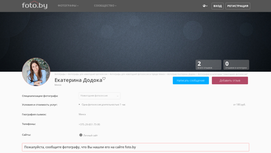 | AI-анализ | --- This online resource is a photography portfolio website for Ekaterina Dodoka, a photographer based in Minsk, Belarus. The website showcases her work in various categories, with a focus on new year photography sessions. Services offered include family and children photography, maternity shoots, love story photography, and photography for christenings. The website provides contact information for the photographer and allows users to leave reviews. The main page of the website displays a catalog of photographers, with a section dedicated to photographers for new year photography sessions in Minsk. Ekaterina Dodoka's portfolio is featured in this section, along with pricing information and her contact details. The website also includes a blog and a community section for photographers. |