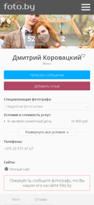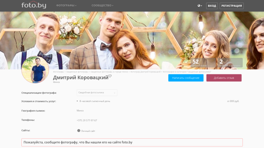 | AI-анализ | --- The portal is a photography website for Dmitry Kovarczyk, a family photographer based in Minsk, Belarus. The website primarily showcases his work in the "Wedding Photography" category. The photographer's main services include family, wedding, and newborn photography, as well as sessions for various events and occasions. The website provides information about the photographer's rates and services, contact details, and a portfolio of his work. Users can leave reviews and view other photographers' portfolios on the site. The site also includes a community for photographers and a blog. The domain is family.foto.by. |