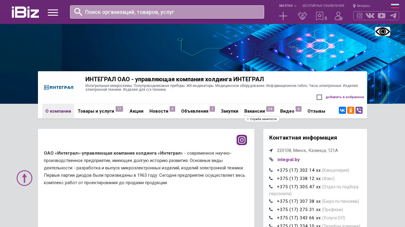 | Название / Заголовок | ИНТЕГРАЛ ОАО - управляющая компания холдинга ИНТЕГРАЛ - Интегральные микросхемы. Полупроводниковые приборы. ЖК-индикаторы. Медицинское оборудование. Информационное табло. Часы электронные. Изделия электронной техники. Изделия для с/х техники.. 220108, Минск, , Казинца, 121А |