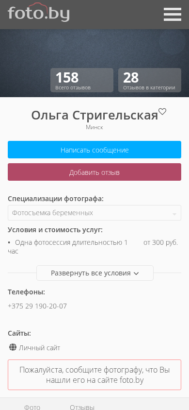 | AI-анализ | The portal is a website dedicated to photographer Olga Strigelskaya from Minsk, Belarus. The site showcases photographs in the category "Photo Shooting for Pregnant Women." The photographer offers photo sessions for newborns and older children, as well as for pregnant women. Appointments are preferred. |