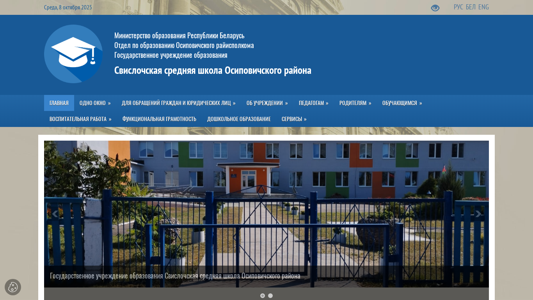 | AI-анализ | The web project "Свислочская средняя школа Осиповичского района" (Svisloch Middle School of Osipovichy District) is a Belarusian educational institution website. The title of the webpage is "Свислочская средняя школа Осиповичского района" (Svisloch Middle School of Osipovichy District). The description includes phrases like "подробнее" (more), "образования" (education), "школа" (school), "новости" (news), "учреждения" (institutions), "осиповичского" (Osipovichy District), and "района" (region). The top keywords are "2025", "подробнее", "образования", "средняя", "школа", " |