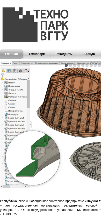 | AI-анализ | --- This online resource is the official website of the Technological Park of Vitsebsk State Technological University (NTPVGtu). It offers support for the creation of high-technology productions and provides services related to scientific, scientific-technical, and innovative activities of the park. The park aims to accommodate residents and provide them with favorable conditions for business development, including the rental of various types of real estate and infrastructure. The website includes sections for news, branches, catalogs of equipment, and a list of residents. Keywords associated with the site include 'technopark', 'Vitebsk technopark', 'technopark VGtu', 'ntpvgtu', 'rental of premises', and 'additive technologies', among others. The top words on the site are 'technopark' (10 occurrences), 'activity' (6), '2025 |