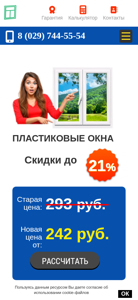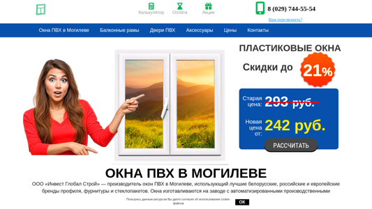 | AI-анализ | The web project "Okna PVH in Mogilev Cheap: Buy PVC Windows in Installment | Invest Global Stroy" is a website dedicated to the sale of PVC windows in Mogilev, Belarus. The company, "Invest Global Stroy," is a producer of PVC windows using top-quality Belarusian, Russian, and European brands for profiles, fittings, and glass packages. Windows are manufactured on the factory floor using automated production lines, ensuring high-quality control. The website offers a 21% discount and various financing options, including a 24-month installment plan and a 0% interest rate. The site includes a calculator for payment and pricing, as well as contact information and customer reviews. Windows offered include single-hinged (glued), two-hinged (turning and sliding), and three-hinged (turn |
