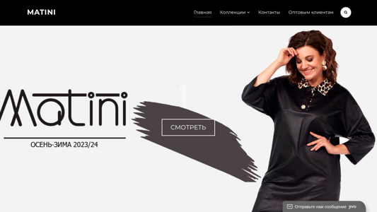| AI-анализ | The website is for a Belarusian knitwear company named Matini. The homepage includes a toggle navigation menu with options for 'Home', 'Collections', 'Contacts', and 'Optim for Clients'. The 'Collections' section features two options: 'Fall-Winter 2024/25' and 'Spring-Summer 2023'. The website's footer displays contact information and a business messenger for inquiries. The domain is matini.by. |