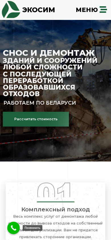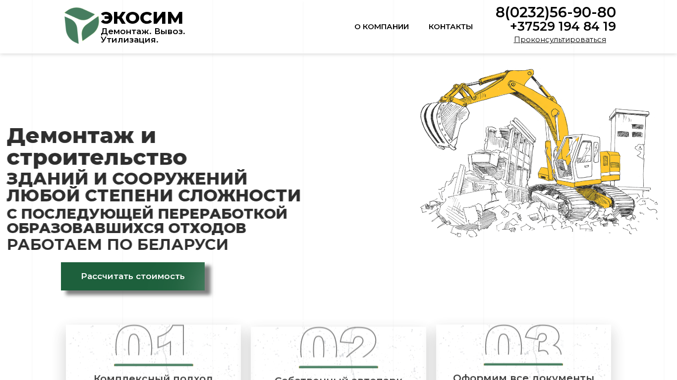 --- The web project "Утилизация Гомель – ЭКОСИМ" offers services for demolition and disposal of buildings and structures in Belarus. The company specializes in complex projects from demolition of any complexity to the disposal of resulting debris at their own recycling plant. The company owns a fleet of machinery for self-delivery to the site and continuous work, even in case of equipment failure. All necessary documents are arranged with regulatory bodies prior to starting work. Services include demolition of industrial buildings, high-rise structures, metal structures, foundations, bridges, and partial demolition of buildings, as well as pipeline demolition and garage dismantling. Additionally, the company provides recycling services for construction waste, including crushing concrete, reinforced concrete, bricks, and other materials, with metal separation.