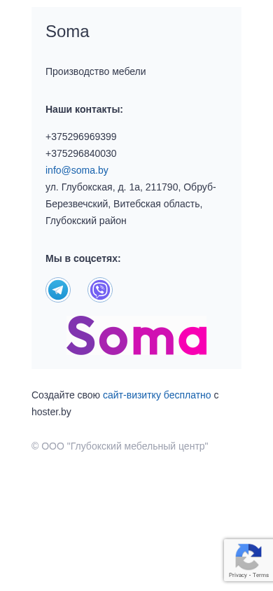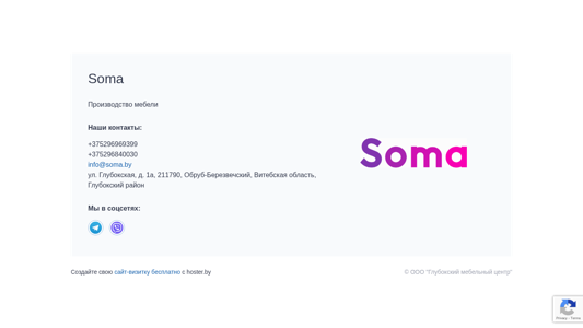 | AI-анализ | The web project Soma is a furniture production company based in Obrub-Berezvechsky, Vitsebskaya oblast, Głuboksy district, Belarus. The website provides information about the company's contacts, including phone numbers +375296969399 and +375296840030, and email address info@soma.by. The address is listed as ul. Głubokska, d. 1a, 211790. The website also includes social media links and an invitation to create a free website visit card with hoster.by. The site allows users to submit inquiries with their name, phone number, email, and message. The page includes a confirmation message upon submission. The keywords associated with the project include 'soma', 'production', 'furn |