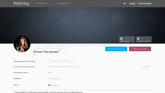 | AI-анализ | The portal is a photography website by Julia Pigareva from the city of Lida in Belarus. The site showcases photographs under the category "Individual Photo Shoots". Julia offers her photography services for individual sessions in the city. The website is part of the Foto.by network, which includes a community of photographers, a catalog of photographers, and various other features. The site includes sections for different types of photography, such as automobile, animal, architecture, children, corporate, wedding, family, food, love stories, and various others. Users can search for photographers, view their portfolios, read reviews, and contact them directly. Julia's personal website can be found within this network. The site also includes a blog, announcements, and a help section. The website was visited on November 29, 2022, and had no reviews in the category at |