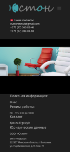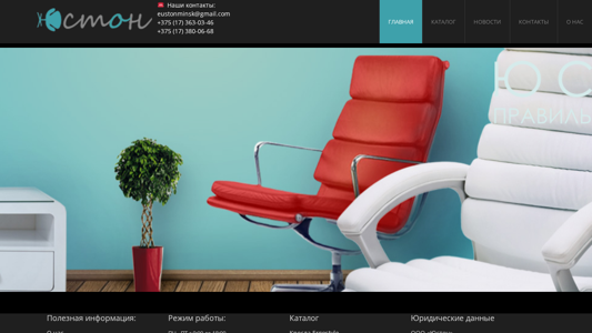 | AI-анализ | This online resource, titled "Юстон" (Euston), is a business website dedicated to selling ergonomic chairs under the brand "Ergostyle." The homepage includes sections for the catalog, news, and contacts. The contact information provided includes email addresses and phone numbers for the company, located in Belarus, specifically in the Vоложин region of the Miнская область. The company's name is identified as ООО «Юстон» (OOO "Юстон"), and its Unified State Register number is 191283594. The website's design and development were completed by MAXI.BY Media. The site offers a contact form for users to request a callback. |