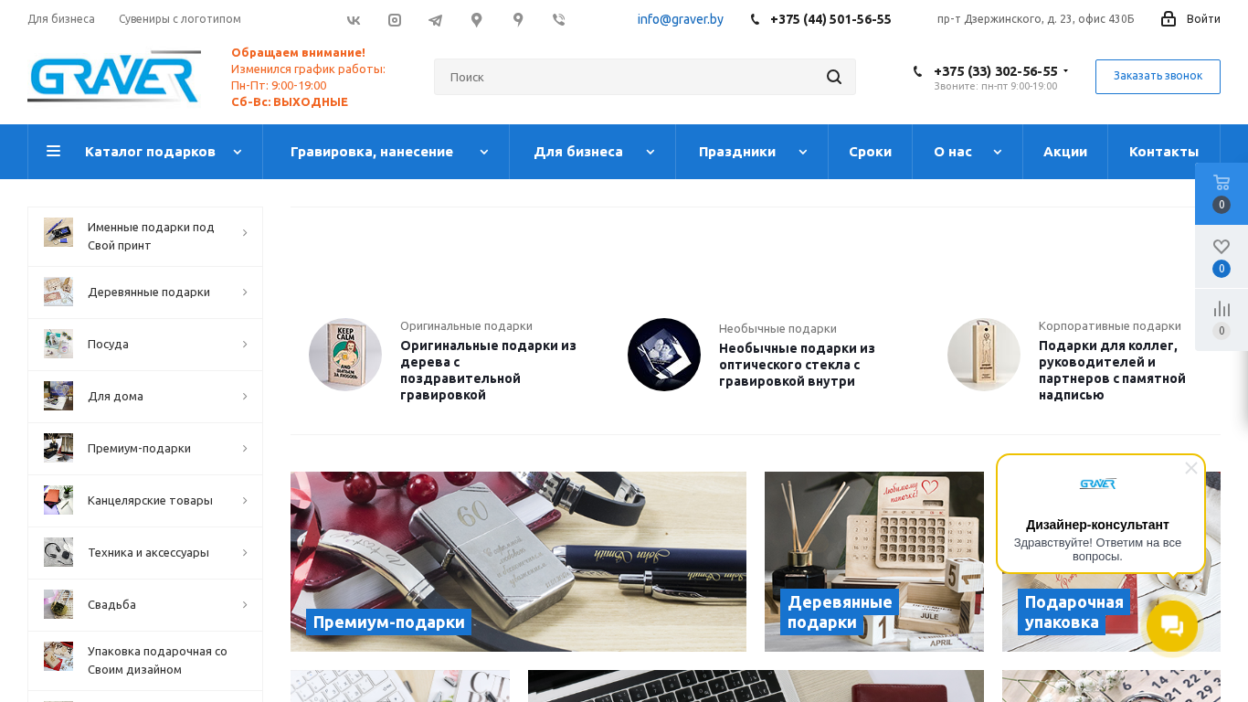 | AI-анализ | The portal "Гравировка в Минске на подарках" is an e-commerce website specializing in laser engraving and gravure services on various items, including gifts, souvenirs, and different materials. The business accepts both retail and wholesale orders. The website features a designer consultant and offers custom engravings for businesses, particularly for souvenirs bearing company logos. The business can be found on Vkontakte, Instagram, Telegram, Google Maps, and Viber, and contact information includes two phone numbers, two addresses, and an email address. The working hours have recently changed to Monday through Friday, 9:00-19:00, and Saturday and Sunday, closed. The catalog includes a variety of personalized gifts, such as iPod accessories, jewelry, keychains, and decorative items for the home. The engraving techniques include laser |