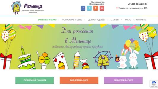 | AI-анализ | --- The portal Melnica-centr.by is a children's education and recreation center offering creative and developing activities for children aged 1 to 12 years. It features a mini-sad for children aged 2 to 6 years, and a fitness center for adults. The center is located just 2 minutes from Uruchje metro station and can be reached by calling +375296540954. The center provides classes, courses, and workshops for children aged 2-6 and 7-12 years. It also offers weekend activities, a children's day, birthday parties, and rentals of halls with animators for special occasions. Parents choose Melnica-centr.by for its author-driven programs based on proven educational methods, small groups of up to 6 children, individualized approaches to each child, formation of groups not only |