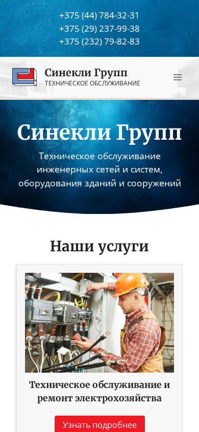 | AI-анализ | The website "Sinekli Grupps — Техническое обслуживание" is dedicated to providing technical services for various systems and equipment in buildings and structures. The main keywords associated with the website include "ремонт" (repair), "техническое обслуживание" (technical maintenance), "обслуживание" (service), "оборудования" (equipment), and "375" (Belarusian phone code). The website offers services related to the technical maintenance and repair of electrical systems, ventilation and air conditioning, heating systems, water supply and sewage, and technological equipment. It also provides services for the maintenance and repair of refrigeration equipment and KIPiA systems. The website features the contact information for the company, including phone numbers and email addresses, as well as a section for customer reviews. The website also includes a menu |