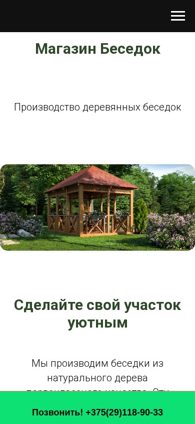 | SEO-описание | Мы производим беседки из натурального дерева первоклассного качества. Эти беседки отлично подойдут для обустройства участка, станут местом, где вы сможете отдохнуть и провести время с близкими людьми |