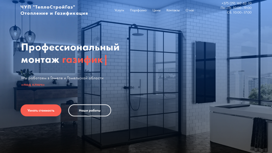 | AI-анализ | The portal GazTeplo.by is a Belarusian website dedicated to heating, gasification, and floor heating services in the city of Homel and Homel Oblast. The company, ChUP "TeploStoyGaz," offers a range of services including gas pipeline installation, heating systems, water supply, and tiled floors. Prices for various services are listed, such as 80 BYN for water supply installation, 16 BYN per square meter for tiled floors, 350 BYN for boiler installations, 1800 BYN for gasification, and 1500 BYN for central heating system installation. The website features a contact section with phone number, hours of operation, and a contact form. The company provides a full spectrum of technical services for gas pipeline installation and heating systems, as well as water supply and floor heating. |