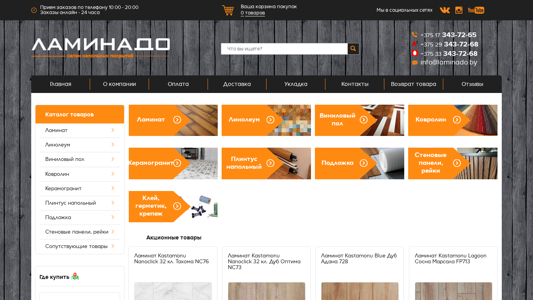 | AI-анализ | --- The portal LaminaDo offers a vast selection of laminate, linoleum, and vinyl flooring with delivery available in Belarus and Minsk. Customers can calculate the required flooring area and work with installment plans. Delivery is provided in Minsk and Belarus. For consultations, call +375(17) 343-72-65, +375(29) 343-72-68, or +375(33) 343-72-68. The catalog includes a wide range of flooring products such as AGT Classen, BinylPRO, Egger Lamet by Ideal, Lamet be Bonkeel, Joss Beaumont, Ultradecor, Kastamonu, Tarkett, Viva Floor, Quick |