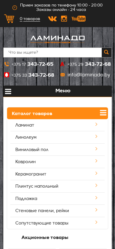 | SEO-описание | В нашем магазине представлен огромный выбор ламината, линолеума и виниловых полов. Выполним расчет необходимого количества напольного покрытия. Работаем с картами рассрочек. Доставка по Минску и РБ. Звоните, проконсультируем: +375(29) 343-72-68 А1, +375(33) 343-72-68 МТС, +375(17) 343-72-65 Город. |