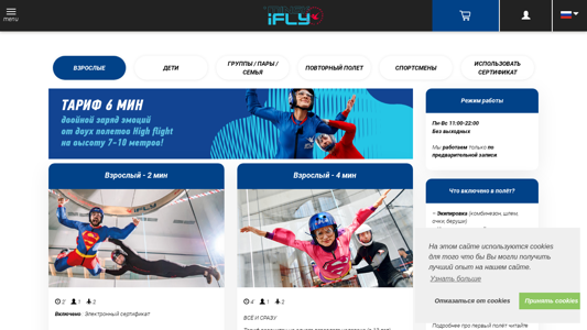 | AI-анализ | The web project iFLY Minsk - Взрослые is a website dedicated to offering skydiving experiences for adults. It provides information on various tariffs, each with a different duration and level of assistance from instructors. The site includes a 'Cookie Policy' section, where users can learn about the use of cookies on the site and opt in or out. The main menu consists of sections for adults, children, groups, and repeat flights, as well as options for sportsmen and using a certificate. The site also offers three different tariffs: a 2-minute Proba 'Крыла' trial for those new to the experience, a 4-minute 'ВСЕ И СРАЗУ' experience for those wanting a comprehensive skydiving introduction, and a 6-minute 'Максимум Впечатлений' tariff for those seeking maximum thrills. Each tar |