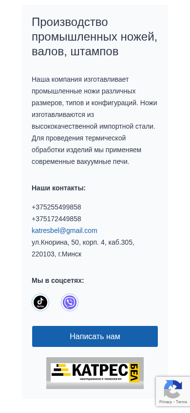 | AI-анализ | The portal is a manufacturing company specializing in the production of industrial knives, rolls, and stamps. The company produces a variety of industrial knives in different sizes, types, and configurations. These knives are manufactured from high-quality imported steel. The products undergo thermal processing using modern vacuum furnaces. |