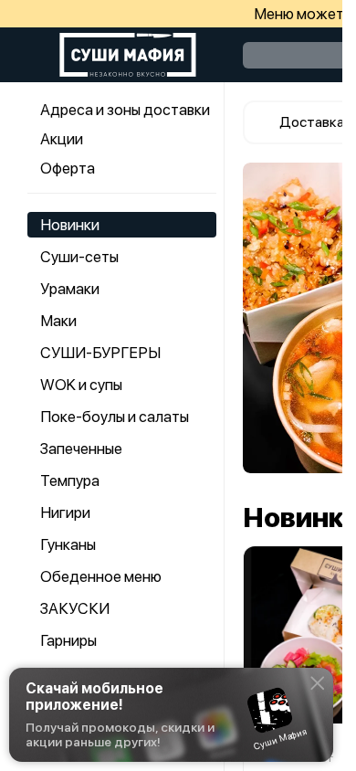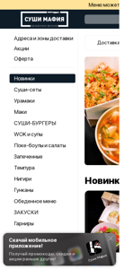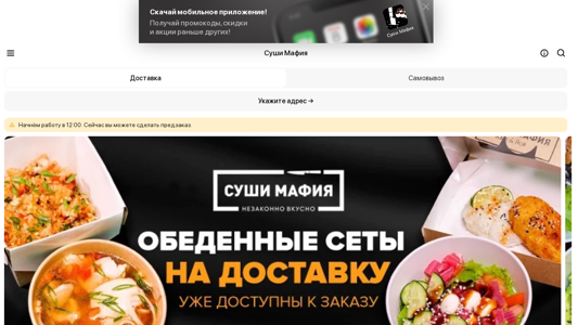 | AI-анализ | The portal Sushi Mafia Vitebsk is an online sushi ordering and delivery platform. It offers a variety of sushi rolls, such as Temptura Nori, rice, tvorozhnyi syr (tvrog cheese), oghurets (cucumber), losos (salmon), kunzhut (sesame seeds), and tempura. The menu includes sets, burgers, and poke bowls, as well as soups, zakuski (appetizers), garnishes, and oven-baked items. The delivery and self-pickup service begins at 12:00 PM, and customers can place a pre-order. The website features several promotions, including discounted rolls and a special Amur sushi set. The prices range from 9.90 to 25 rubles per item, |