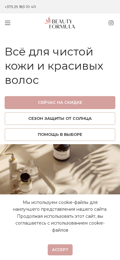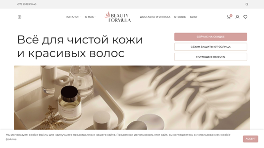 | AI-анализ | This online resource is a Belarusian e-commerce website specializing in cosmetics sales. The title of the website is 'Beauty-formula Интернет-магазин косметики' and it offers various products such as tonics, creams, masks, and more for the face, body, and hair. The description section is empty. The top keywords include 'products', 'кофе', 'wishlist', 'тела', 'compare', 'quick', 'view', 'add', 'корзину', 'кремы', 'волос', 'лица', 'детей', 'roast', 'свежеобжаренный', 'зерновой', '200г', 'гельтек', 'кожи', 'уход'. The website sells 12 products under the category 'Демакияж |