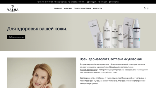 | AI-анализ | The web project "VASHA Cosmetics" is an online store specializing in cosmetics. The website is operated by practicing dermatologist Svetlana Yakubovskaya, who has over 11 years of experience in her field and has treated over 17,000 patients. She offers solutions for various skin issues using her own effective formulations, with a focus on healthy and long-lasting skin. The website features a range of products including an antioxidant tonic, spot treatment paste, gentle cleansing gel, cleansing oil, calming and hydrating serum, antioxidant serum, peptide serum, and a rejuvenating emulsion. Prices range from 49 BYN to 145 BYN. The store also offers special deals on bundled products. The website is open for |