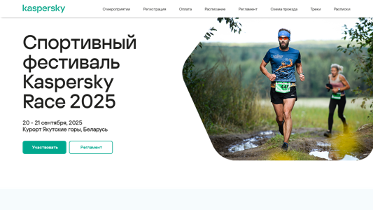 | AI-анализ | --- The web project Kaspersky Race 2025 is a sports festival taking place in the Yakutskie Gory resort, Belarus, on September 20-21, 2025. The festival invites participants to register and pay for various sports events, including trail running with distances of 5, 10, and 21 kilometers, and a mountain run named 'Czar of the Mountains.' For cycling enthusiasts, there are 28, 45, and 90-kilometer routes, as well as multi-day cycling competitions. An adventure race for teams of two is also offered, featuring a combination of running, cycling, and special challenges. A children's trail of approximately 1.5 kilometers is available for younger participants. All routes are located in the Dzerzhinsky district and include challenging terrain, |