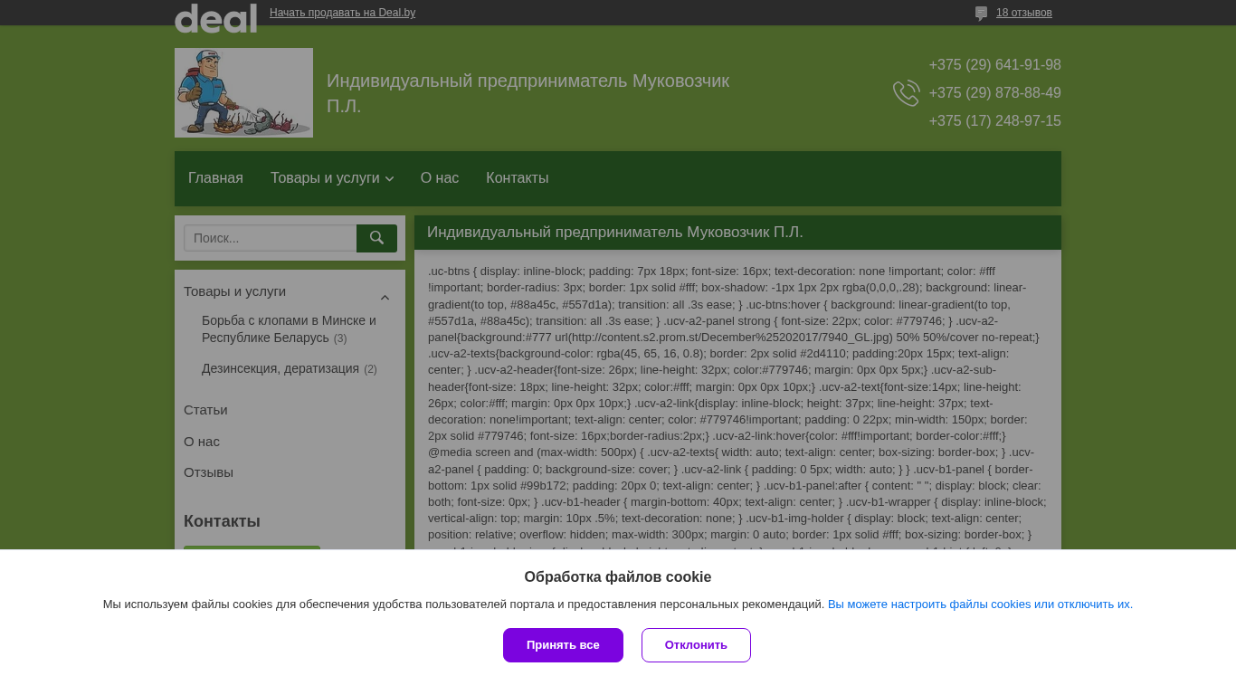 | SEO-описание | Контактная информация, товары и услуги компании "Индивидуальный предприниматель Муковозчик П.Л." |