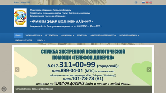 | AI-анализ | This online resource is a website for Ilyan Middle School named after A.A.Grimotya in Belarus. The website uses cookies to enhance the functionality and personalize the content of the site. By staying on the site and clicking the "Accept" button, users acknowledge that they have read and agreed to the Cookie Policy and its terms. The website was last updated on Thursday, October 9, 2025. The site supports multiple languages including Belarusian, Azerbaijani, Bengali, Burmese, Cantonese, Danish, Dutch, English, Filipino, French, German, Gujarati, Hindi, Hungarian, Indonesian, Irish, Italian, Japanese, Kazakh, Kyrgyz, Laotian, Latvian, Latin, Lithuanian, Maltese, Malay, Malayalam, Marathi, |