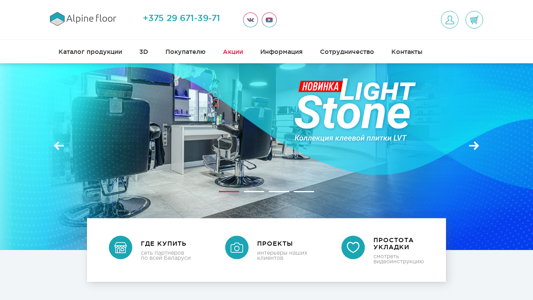 | AI-анализ | The website is an e-commerce platform selling Quartz vinyl flooring named Alpine Floor in Belarus and Russia. The website offers various collections, including Chevron, Alpine Classic, Classic Light, Expressive Parquet, Grand Sequoia, Superior ABA, Village Intense Parquet, Light Parquet, Premium, Premium XL, Real Wood Sequoia, Solo, Solo Plus, Stone Mineral Core, ECLIPSE SUPER MATT, NUT, Norland, Neowood, Sigrid Plus, Lagom Parquete, Sigrid, Sigrid Superior ABA, Vakre, Art Parquet, Ottimo PREMIUM, Verano, and Alpine Floor by Classen Pro Nature. The flooring is available in different types of bonding, such as Castle Chateau Studio Villa, and various accessories including |
