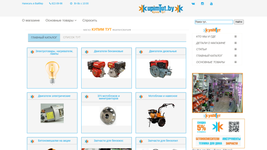 | AI-анализ | The portal Kupim Tut in Baranavichy offers a wide range of products including engines, electric engines, motor mowers and trimmers, spare parts for motor mowers, motor blocks and attachments, gas lawn mowers, concrete mixers, min tractors, pumps, welding equipment, and electrical appliances. The catalog includes sections for water heaters, disinfection units, temperature regulators, and generators. The website provides options to contact via WhatsApp 822-09-98 and offers a main catalog, a list of products, and a section for electro appliances, water heaters, and pumps. The products available include various types of engines, motorbikes, attachments, agricultural equipment, and auto accessories. There are sections for generators, tools, and auto parts. The website is based in Baranavichy. |