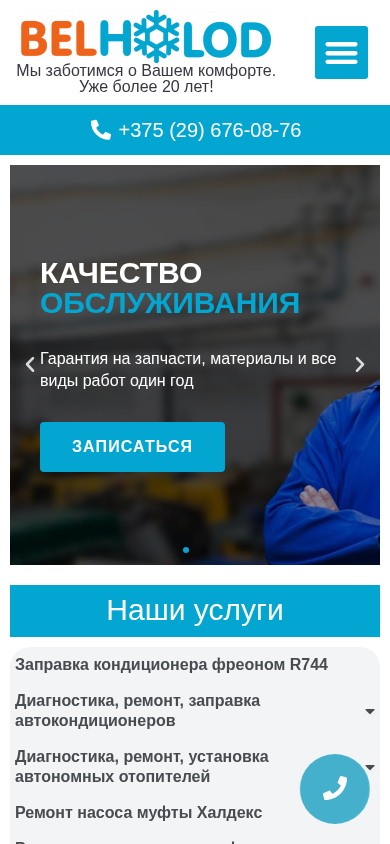 | AI-анализ | --- The portal Belholod.by offers services and products related to the maintenance and repair of air conditioners and autonomous heaters from Webasto. With over 20 years of experience, they guarantee high-quality services and original parts for all repairs. The website features a blog, contacts, and a menu with sections for services such as conditioner refill with R744, diagnostics and repair of air conditioners, and installation and repair of autonomous heaters. Other services include repairing compressors, radiators, and tubes for hydrosteering systems, as well as repairing refrigerators. The website also provides information on the repair and conversion of heaters into autonomous ones, and the repair and maintenance of Haldlex pumps. The top words on the website include 'repair', 'autocondiioner', 'compressor', 'parts', 'heater', and 'diagnostics |