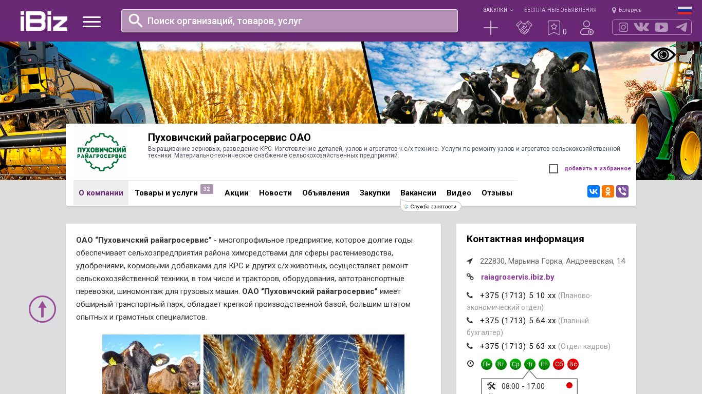 | Название / Заголовок | Пуховичский райагросервис ОАО - Выращивание зерновых, разведение КРС. Изготовление деталей, узлов и агрегатов к с/х технике. Услуги по ремонту узлов и агрегатов сельскохозяйственной техники. Материально-техническое снабжение сельскохозяйственных предприятий.. 222830, Марьина Горка, , Андреевская, 14 |