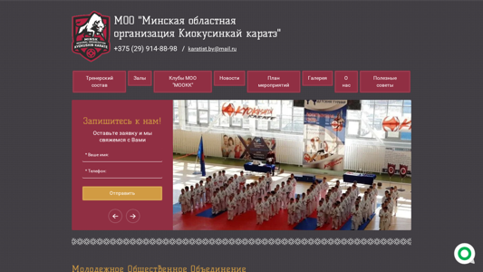 | AI-анализ | The web project "Minsk Regional Organization of Kiokushin-kaite Karate" is a website dedicated to a martial arts club based in Minsk, Belarus. The website provides information about the club's training sessions, focusing on the techniques of Kiokushin-kaite Karate, throws, and weapons training. Emphasis is placed on physical preparation, special physical conditioning, flexibility, and self-defense techniques. The menu includes sections for the trainer's roster, training halls, clubs, news, and upcoming events. Some of the highlighted events include the 'Golden Lynx' and 'Seiken' tournaments in Grodno, the 'Young Lions Cup 2023' regional tournament in Minsk, and the 'BELARUS OPEN CUP' international tournament in Minsk. The website also mentions past events like the ' |