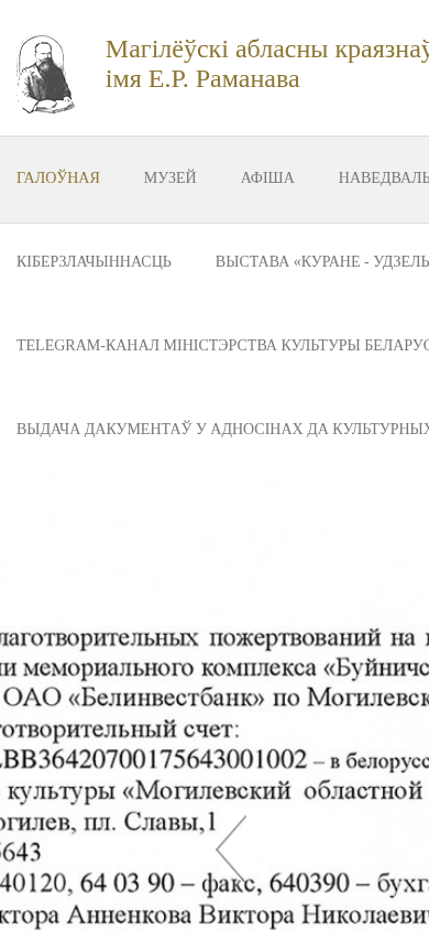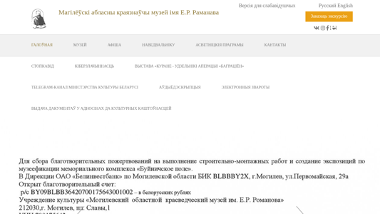 | AI-анализ | The website is the official page of the E.R. Ramanava Memorial Museum and Ethnographic Museum in Mogilev, Belarus. It provides information about the museum's history, exhibitions, and opening hours. Current exhibitions include "Cultural Figures of 'Bagratsyan'" and "What They Named Magilev...". The museum's archaeology and old history exhibition was opened in 1997 and is located on the first floor. The history of the region from the 9th century to the beginning of the 20th century is displayed on the second floor. The history of the region during the Soviet era (1917-1945) is exhibited in four rooms on the third floor. The "Nature of the Land" exhibition offers a vibrant look into the natural history of the region. The museum also offers tours, which can |