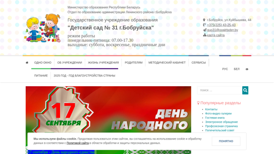 | AI-анализ | --- The portal sad31.bobruisk.edu.by is a website for the Kindergarten No. 31 in Bobruisk, Belarus, under the Ministry of Education of the Republic of Belarus and the administration of the Leninsky district. The site provides information about the kindergarten's schedule, administrative procedures, electronic applications, popular inquiries, contacts, and the institution's mission, goals, and functions. It includes sections on the management team, social-psychological services, normative documents, emergency assistance for disabled individuals, vacancies, and policies on confidentiality and life of the kindergarten. The site also features photo-video galleries, a school development project, and a pro-union page. Users can find information on the kindergarten's conditions for admission, the work of its staff, and various services offered, including paid ones. The |