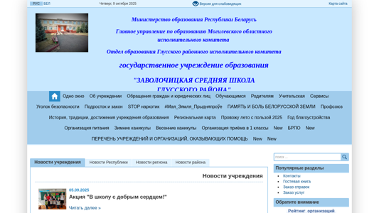 | AI-анализ | The website "Заволочицкая СШ" (Zavaloch.glusk.edu.by) is the official website of the state educational institution "Заволочицкая Средняя Школа Глусского Района" (Zavalochskaya Srednya Shkola Glusskogo Rayona) located in the Guskovsky District of the Mogilev Region in Belarus. The website provides information about the school, its administration, educational programs, schedules, and contacts. The dominant keywords on the website include "2025," "читать" (read), "далее" (further), "новости" (news), "образования" (education), and "заказ" (order). The website is designed with standard font sizes and average inter-letter spacing. The color scheme is standard, |