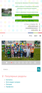 | AI-анализ | This online resource belongs to the website of Kindergarten No.1 in the city of Glusk, under the Ministry of Education of the Republic of Belarus. The main pages of the website are managed by the Glusk District Executive Committee's Education Department. The Kindergarten is a state educational institution located on Kirov Street, 96a, in Glusk. Contact information includes a phone number (+375-2230-78-166) and email address (verasok@glusk.edu.by). The website includes sections for administrative procedures, contacts, and a phone directory. It also features a map of the site, a single-window service, and pages for working with personnel data, normative documents, and citizen appeals. The kindergarten's schedule, admission procedures, and "direct" phone lines are also provided. There are sections for frequently asked questions |