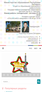 | AI-анализ | --- This online resource belongs to the Kindergarten No. 4 in the city of Krichev, under the Ministry of Education of the Republic of Belarus, Krichev District Executive Committee, and is a State Educational Institution. The kindergarten operates from Monday to Friday, from 07.30 to 18.00. Its telephone hotline is available daily from 08.00 to 13.00. The head is Natalya Petrovna Bogacheva. The kindergarten is located at Karl Marx Street, No. 19a, in Krichev. The website contains information about the kindergarten's structure, conditions for admission, the pedagogical team, and its history and traditions. It also provides information about various educational services, the quality assessment of those services, and methods for contacting the kindergarten. |